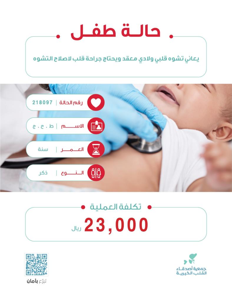 يعاني في قلبه وهو بحاجة ماسة لدعمك وعطائك، فساهم في شفاء قلبه الصغير.