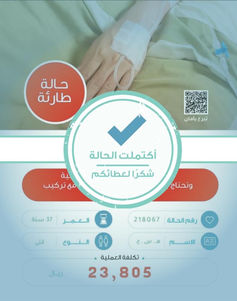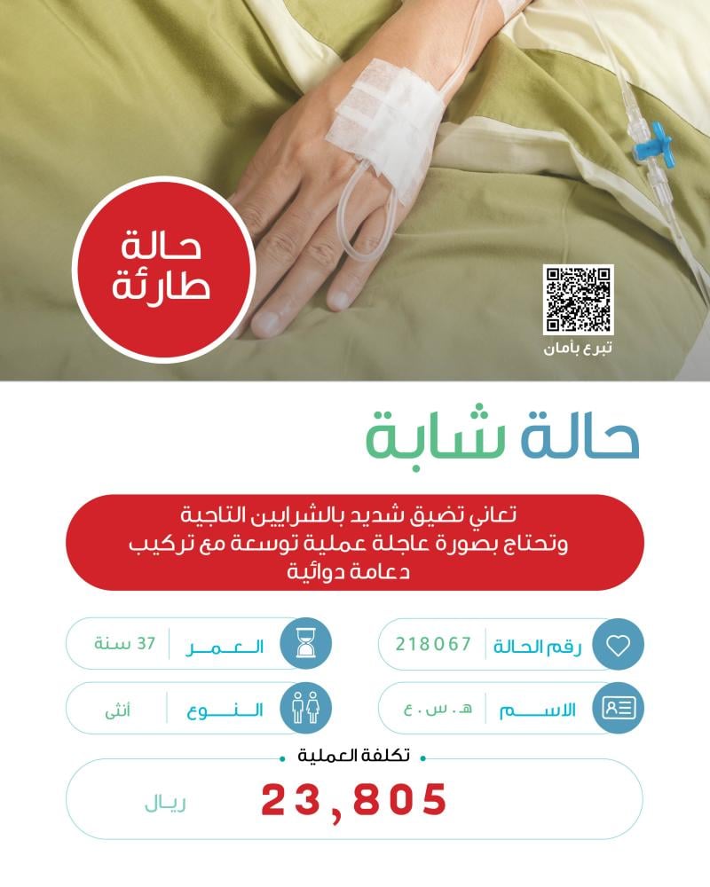 نحنُ معكم اليوم لنوصيكم بتبرع يومي بقدر ما تستطيعون، ومعنا حالة لشابة تعاني من تضيق شديد بالشرايين التاجية، وقد أثر مرضها على يومها بشكلٍ كبير، والسبيل للعلاج والأمل أنتم..