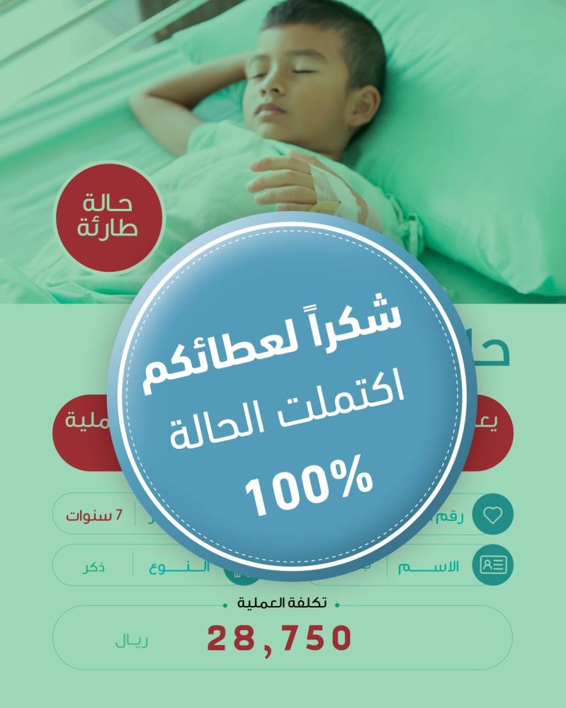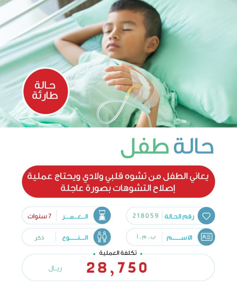 حالة طفل يبلغ من العمر 7 سنوات يعاني من تشوه في القلب منذ الولادة ويحتاج إلى عملية إصلاح التشوهات بصورة عاجلة:
